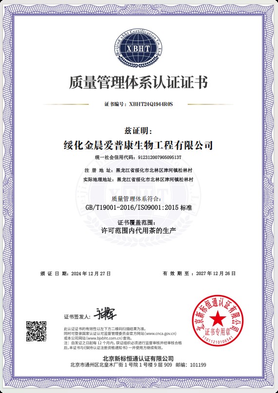 綏化金晨愛普康生物工程有限公司已成功通過質量管理體系認證,環境管理體系認證,職業健康管理體系認證。